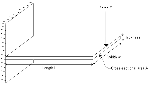 where M is the moment generated by the force F (M = Fl), c is the distance from the neutral axis to the edge of the beam (c = t/2), and I is the area moment of inertia (I = wt 3 /12). This result is obtained by considering the bending of a beam with Hooke's law (|F| = k|d|). This law states that force is a linear function of displacement. This statement forms the basis of classical stress analysis and modern finite element stress analysis.