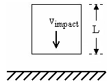 Using the software, we simulate the same impact problem. We model a cube of length (L) 1.0 in, and mass (m) 0.000253 lbm. It is comprised of a material with a modulus of elasticity,E, of 107lb/in2. The event simulated is actually the dropping of the cube from a height of 100 in. It results in an impact velocity (vimpact) of 278 in/sec. when under the influence of a gravity field of strength 386.4 in/sec2. The software predicts a maximum deformation (ΔL) of 0.000694 in. which compares favorably with the value of 0.000699 in. given by equation [6].
