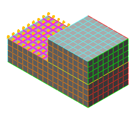 | Color by Surface – Top surface of large part is selected (magenta color). Note how the top is one big surface without using the surface splitting option. | Color by Surface – Top surface of large part is selected near the left end (magenta color). Note how the top is split into two portions when using the surface splitting option. |