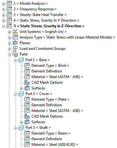 One FEA model (one .FEM file) can contain numerous analyses or Design Scenarios. The results of each scenario are saved in a separate folder under the main model folder. For example, one model could contain all these analyses: