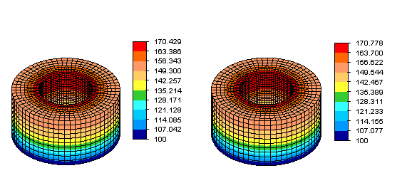Figure 3 depicts the Steady-State Heat Transfer results of a single-part model of a ring with and without microholes. The microholes resulted in a more typical 0.00046 volume fraction. As in the Static Stress with Linear Material Models analysis, both versions of the model produced highly similar results. Figure 4 depicts displacement results obtained using Autodesk Simulation’s Mechanical Event Simulation (MES) software for the two versions of the ring model. Even for nonlinear FEA, the presence of microholes did not significantly affect the results. Finally, Figure 5 depicts voltage results obtained using Autodesk Simulation’s Electrostatic Current and Voltage analysis for the two versions of the model. As expected because of the underlying similarities between electrostatic and thermal analysis, the presence of microholes had little effect on the results.