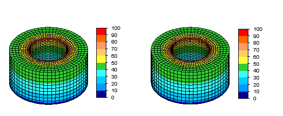 Figure 5: Voltage distributions obtained from Electrostatic Current and Voltage analysis for ring model with a voltage of 100 V applied on the inner edge of top surface, and 0 V applied on the outer edge of the outer surface. The figure on the left is for the model without microholes, whereas that on the right is for the model with microholes. A comparison of the maximum voltage on the outer top edge shows a difference of 0.02% between the two models.