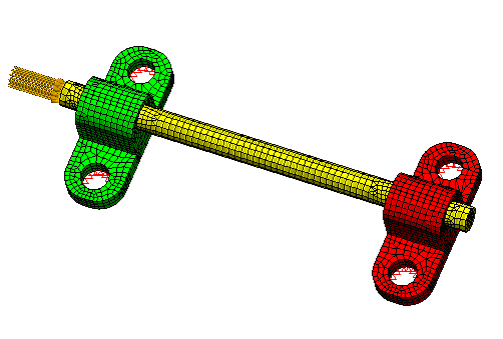 Figure 1: FEA model, including mesh, of a three-part assembly of a circular rod bonded to two brackets, which are fixed using boundary conditions on the edges of the holes located on their flat ends (red triangles on the underside). In the Static Stress with Linear Material Models analysis, a surface force of 5.0 x 108 dynes is applied on one end of the rod (yellow arrows).