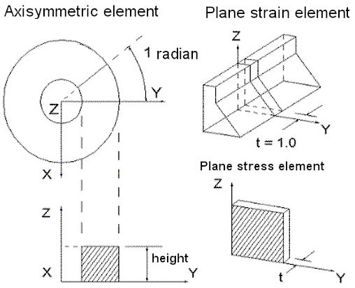 - Axisymmetric: Select this geometry type for elements that model solids with geometric, load and boundary condition symmetry about the Z axis. Negative Y coordinates are not admissible. If a node lies along the axis of revolution (the Z axis) the translation in the Y direction must be constrained. Nodal loads are normalized by the number of radians in a circle (load divided by radians).