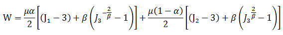 Alpha (α) is a material constant introduced during the derivation of the strain energy form. This value is derived using the curve fit algorithm based on the stress-strain curves. α=1 is suggested for a rubber-like material. For example, µ=200711.2 Pa, α=1, and β=13.3 are suggested for polyurethane rubber in the Blatz-Ko's paper.