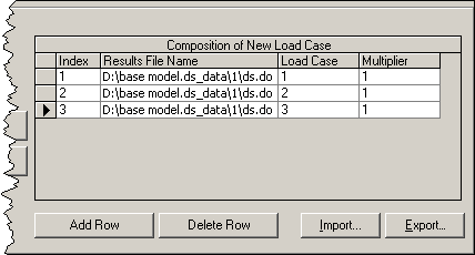 The right half of the Specification of New Load Cases section is used to indicate which previously analyzed models to combine, which load case to use from the models, and the multiplier used for each load case. Use the Add Row and Delete Row buttons to add or delete rows to the spreadsheet to specify additional model results to combine.