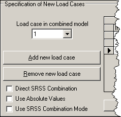 Since the new results can contain multiple load cases, the left half of the Specification of New Load Cases section  is used to create and display the new load cases. The Load case in combined model pull-down is used to set which new load case is being shown in the Composition of New Load Case spreadsheet. New load cases are added to the new results by clicking the Add new load case button. In the previous example, you click the Add new load case button 9 times to get the 10 load cases required. The Composition of New Load Case spreadsheet needs to be filled out before adding a new load case.