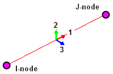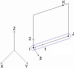 More specifically, the surface number of the line creates a point in space, called the K-node. The two ends of the beam element (the I- and J-nodes) and the K-node form a plane as shown in the following image. The local axes define the beam elements. Axis 1 is from the I-node to the J-node. Axis 2 lies in the plane formed by the I-, J- and K-nodes. Axis 3 is formed by the right-hand rule. With the element axes set, the cross-sectional properties A, Sa2, Sa3, J1, I2, I3, Z2, and Z3 can be entered appropriately in the Element Definition dialog box.