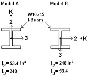For example, the following image shows part of two models, each containing a W10x45 I-beam. Both members have the same physical orientation. The webs are parallel. However, the analyst chose to set the K-node above the beam element in model A and to the side of the beam element in model B. Even though the cross-sectional properties are the same, the moment of inertia about axis 2 (I2) and the moment of inertia about axis 3 (I3) must be entered differently.