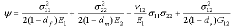 where i corresponds to the four modes I through IV (or dft, dfc, dmt, and dmc). The results are in the range of 0 to 1 where 0 indicates there is no damage and the element can support a full load, and 1 indicates complete damage and the element cannot support any load in the respective direction.