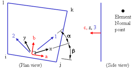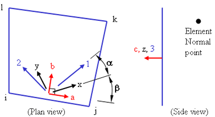 The element local axes (a-b-c) are based on the i-j-k-l sides. The Laminate or Material axes (x-y-z) are rotated α degrees from the element axes (a-b-c). (The material axes are set in the Element Definition on the General tab.) The Lamina axes (1-2-3) are rotated ϑ degrees from the Laminate axes. Axis 1 is parallel to the fibers for each lamina. (The lamina axis is set in the Element Definition on the Laminate tab using the Orientation Angle.)