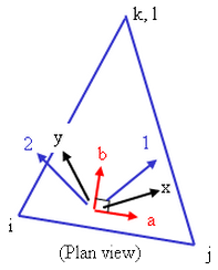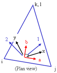 The element local axis a is parallel to the i-j side. The Laminate or Material axes (x-y-z) are rotated b degrees from the element axes (a-b-c). (The material axes are set in the Element Definition on the General tab.) The Lamina axes (1-2-3) are rotated a degrees from the Laminate axes. Axis 1 is parallel to the fibers for each lamina. (The lamina axis is set in the Element Definition on the Composite tab using the Orientation Angle.)