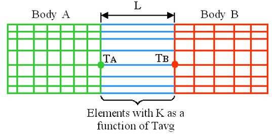 One layer of elements is constructed in a new part between the two bodies. The material model is set to orthotropic so that the material properties are temperature dependent. The conductivity is calculated at estimated surface temperatures T A and T B (in absolute temperature) using the above equation. The calculated conductivity is entered in the material properties at a temperature of Taverage=0.5(T A +T B ) (in either absolute temperature or temperature, as set in the Units Definition dialog). Additional data points are entered by evaluating T average and K at other values of T A and T B . Be sure to include a range of temperatures T average in the material properties to that the calculated temperature is not outside of the range of material properties.