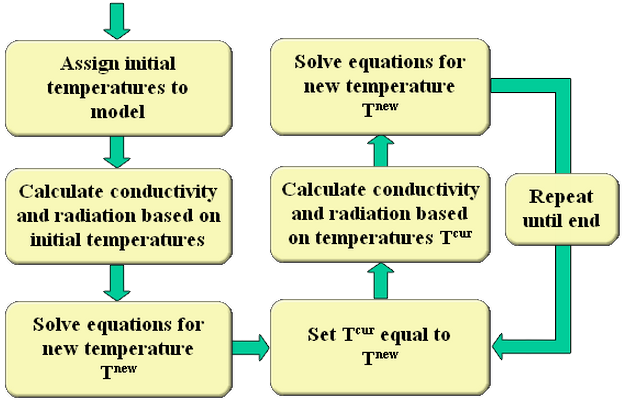 The new assumed temperatures are used to update the conduction coefficients and recalculate the radiation equations and the process is repeated.