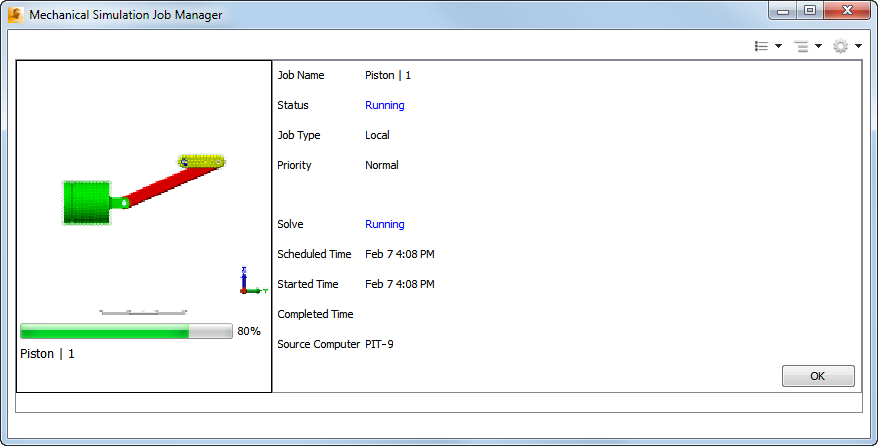 - Details: Opens a detail view of the selected job. The detail view lists the status; job type; priority; scheduled, started, and completed time; source computer (where the solution is run); and the thumbnail image of the model. While running, a progress bar indicates the progress of the simulation. Click OK to close the detail view. An example of the Detail view is shown in the following image: