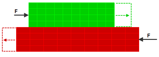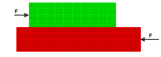 (a) Prior to smart bonding, parts are not bonded because the nodes do not match. (Actually, no type of contact would have worked since the nodes do not match.) A tangential force F causes the parts can separate. |