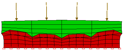 (b) Incorrect. When using Fine bonded to coarse mesh smart bonding, the nodes on the fine mesh are forced to follow the displacement of the coarse mesh. By forcing the fine mesh to bend to the same curvature produced by the coarser mesh, the displacement results are less accurate. Because of the kink or sudden change in slope in each set of 4 elements in the bottom part, the stress results in particular would show high stresses. The same exaggerated displacement scale used in (c) is shown here, so this deflection is noticeably smaller. |