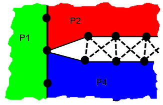 ![]() (a) Example three part model. Parts 2 (P2) and 4 (P4) have surface contact defined between them. Both are bonded to part 1 (P1). |