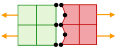 | Without smart bonding, the midside nodes in the part on the right can pull away from the face of the left part. (Only nodes on contact face shown for clarity.) | With smart bonding, the midside nodes are bonded to the face of the left part. Thus, the midside nodes cannot pull away. (Parts shown with slight gap for clarity.) |