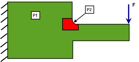 Figure 8: Example Use of Smart Bonding. A mesh sensitivity study can be performed by changing the mesh on part 2 [P2] without the need to re-mesh the entire model. The geometry of part 2 can even be changed, such as comparing a chamfer versus a large radius fillet versus a small radius fillet. |
