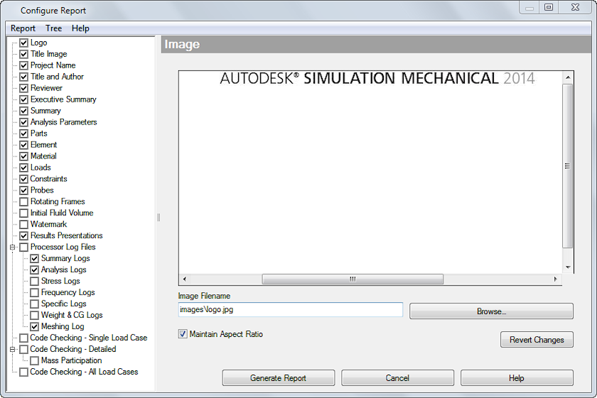 - Title Image defaults to the view from the FEA Editor. It can be replaced with a user-generated image by customizing the report with the Configure Report dialog. (To revert to the default image, which updates to the current view from the FEA Editor whenever the report is regenerated, use the Configure Report dialog box and browse for the file modelnameTITLE.PNG located in the design scenario folder.)