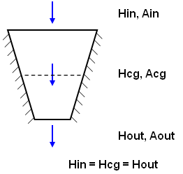 | (a) In a hypothetical model, the heat rate (H) passing through any area is equal, whether at the inlet face, the centroid (cg), or the outlet. | (b) In FEA, the heat flux (hfcg) calculated for the centroid is used to calculate the heat rates (H) through the faces. If Ain and Aout do not equal Acg, the heat in will not equal the heat out. |