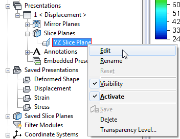 To return to Edit mode, you must right-click a previously defined slice plane heading under the current Presentation in the browser and choose Edit (as shown in the following image):