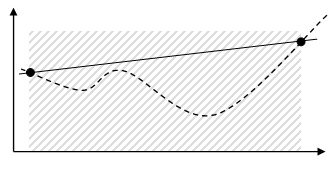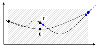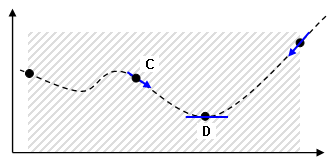 ![]() (b) With the SLP method, the curve is evaluated at the upper and lower limit of the design range. Since the lower limit is the minimum, the line search begins at the lower limit. |