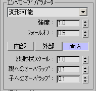 [エンベロープ](Envelope)サブオブジェクト レベルでは、すでに説明した設定以外に、エンベロープの放射状スケールを調整できます。放射状スケールは、エンベロープが頂点をリンクに沿って囲むようにするときに使います。強度、フォールオフ、放射状スケール、およびオーバラップの設定は、[エンベロープ パラメータ](Envelope Parameters)にあります。