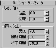 [IK コントローラ パラメータ](IK Controller Parameters)ロールアウトで、IK ソリューションの精度とソリューションのフレーム持続時間を指定します。通常、圧縮するボーンに対しては、ボーンがずれることなくエンド エフェクタに完全に従うように正確なソリューションが必要です。ロールアウトのイメージでは、[位置](Position)の値が 0 で、設定可能な距離の最小値になっています([回転](Rotation)の値はその既定値である 1 になっています。回転エンド エフェクタはこの例では使用されていません)。[反復](Iterations)は高めに設定されているため、キャラクタが大幅に縮小されてもソリューションの正確さは保証されます。開始時間、停止時間はアニメーションの長さにします。