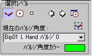 現在のバルジ角度([選択レベル](Selection Level)領域の[現在のバルジ角度](Current Bulge Angle)フィールド)で、角度値をスケルトンの現在の関節角度に変更します。まず、ビューポートで[移動](Move)または[回転](Rotate)を使用して選択したリンクとその子リンクの間の角度を変更し、次に[バルジ角度を設定](Set Bulge Angle)をクリックします。