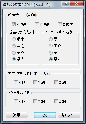 ([位置合わせ](Align))をクリックした後、Box001 オブジェクトをクリックします。