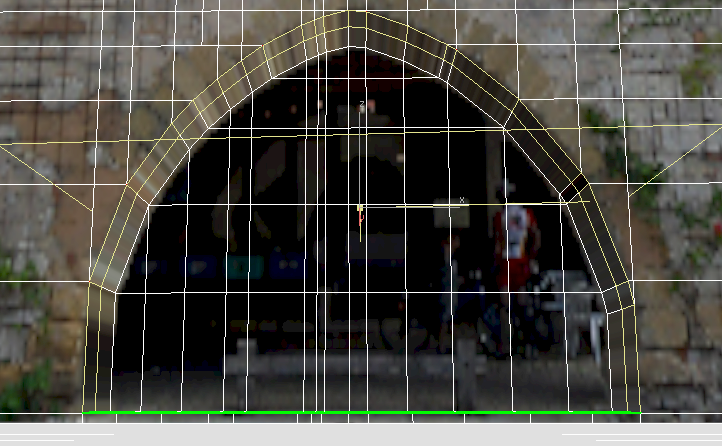 円柱状のギズモには、緑色で表示される高さのセグメントが 1 つ含まれています。このセグメントは、円形状マッピングの継ぎ目の位置を示しています。この時点では、緑色のセグメントはアーチの右側付近にあります。