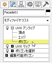 Facade01 と同様に、[UVW アンラップ](Unwrap UVW)を使用して、Facade4 の入り口の面にテクスチャを適用します。これらの面の配置に合わせて、[UVW アンラップ](Unwrap UVW)のさまざまなテクニックを使用します。