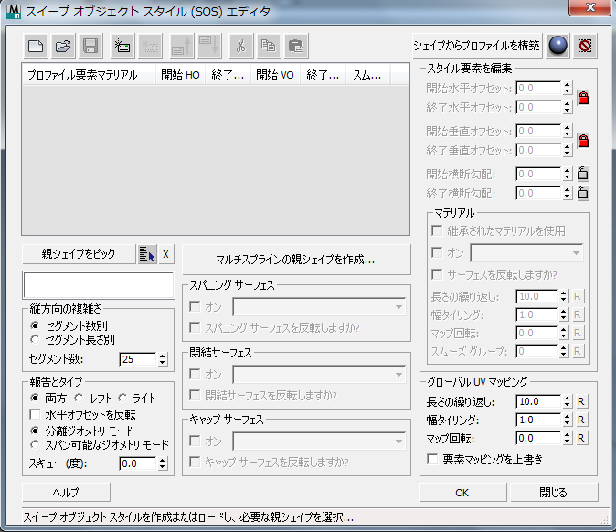 [スイープ オブジェクト スタイル エディタ](Swept Object Style Editor)を選択します。 3ds Max によって[スイープ オブジェクト スタイル(SOS)エディタ]ダイアログ ボックスが開きます。