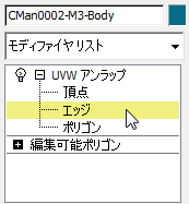CMan モデル(完全な名前は CMan0002-M3-Body)を選択します。 モデルには既に[UVW アンラップ](Unwrap UVW)モディファイヤが適用されていますが、まだ設定は完了していません。作業が簡単になるように、[ポリゴン](Polygon)サブオブジェクト選択セットがいくつか含まれています。