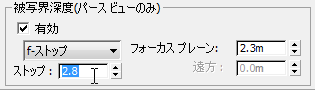 [被写界深度(DOF)](Depth of Field)領域で、ドロップダウン リストを[f-ストップ](f-Stop)(絞りの設定)にしておきます。この操作により、焦点が合っていないオブジェクトのぼやけの度合いを指定することができます。