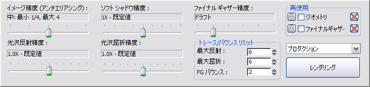 - レンダリング フレーム ウィンドウの下部にある[ファイナル ギャザー精度](Final Gather Precision)スライダを 1 段階右にドラッグして、「ドラフト」から「低」に変更します。