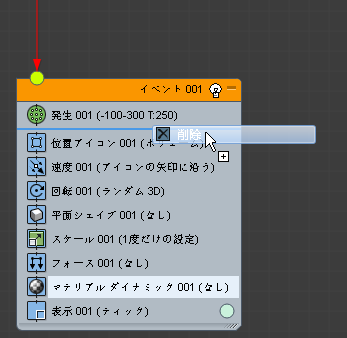 - パーティクル ビューで、Delete オペレータをコンテナからドラッグし、Event 01 の Birth オペレータと Position Icon オペレータの間にドラッグします。