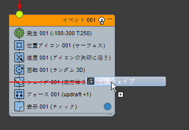 - Scale オペレータをコンテナから Event 01 にドラッグし、Shape Facing オペレータと Force オペレータの間にドロップします。