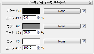 パーティクル エージ マップでは、3 つのカラーを指定します。既定で[カラー #1](Color #1)はパーティクルが発生するとき(0 パーセント)のカラー、[カラー #2](Color #2)はパーティクルが寿命の中間に来たとき(50 パーセント)のカラー、[カラー #3](Color #3)はパーティクルが消滅するとき(100 パーセント)のカラーです。寿命は変更できますが、このチュートリアルでは変更しません。