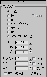 [マッピング](Mapping)領域で、[ボックス](Box)を選択します。 [マッピング](Mapping)領域の上部にあるラジオ ボタン([平面](Planar)、[円柱状](Cylindrical)、[球状](Spherical)など)は、[UVW マップ](UVW Map)モディファイヤがオブジェクトにマップをどのように投影するかを指定します。[ボックス](Box)マッピングでは、マップが 6 つの側面すべてから投影されます。
