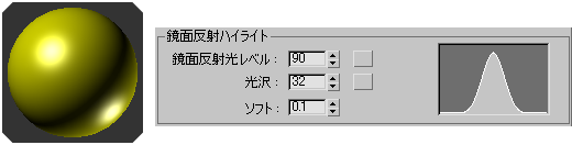 プレビューおよび[鏡面反射光レベル](Specular Level)コントロールと[光沢](Glossiness)コントロールの右にあるグラフのハイライトの幅が狭くなりました。[鏡面反射光レベル](Specular Level)はハイライトの明るさをコントロールし、[光沢](Glossiness)はハイライトの幅をコントロールします。一般に、光沢の強いマテリアルほど、ハイライトは小さくなります。