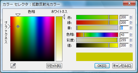 [カラー セレクタ](Color Selector)の[赤](Red)/[緑](Green)/[青](Blue)コントロールを使用して、黄色を選択します。[赤(R)](Red) = 200、[緑(G)](Green) = 200、[青(B)](Blue) = 0 に設定してください。