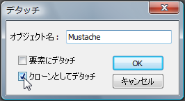 8. [デタッチ](Detach)ダイアログ ボックスで[クローンとしてデタッチ](Detach As Clone)をオンにします。デタッチした面に Mustache と名前を付け、[OK]をクリックします。