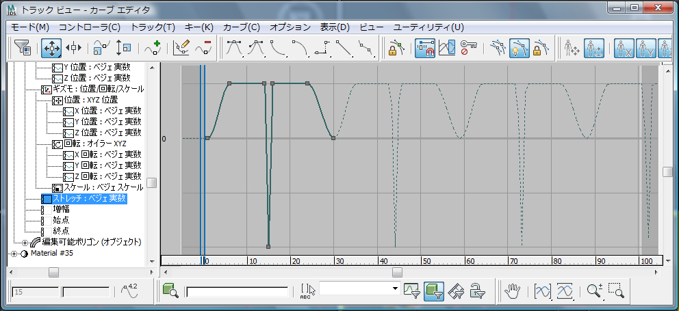 [Stretch : ベジェ 実数](Stretch : Bezier Float)のようになります。この演習では使用していない位置、回転、スケールのトラックの下にあるので、下にスクロールする必要があります。