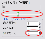 クローンを作成します。レンダリング フレーム ウィンドウの mental ray コントロールで、[ファイナル ギャザー精度](Final Gather Precision)を[低](Low)に変更し、[FG バウンス](FG Bounces)の値を 2 に増やします。