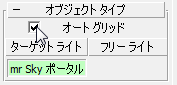 ([ライト](Lights))をクリックします。[オブジェクト タイプ](Object Type)ロールアウトで[mr Sky ポータル](mr Sky Portal)をクリックしてアクティブにし、次に[オート グリッド](AutoGrid)をオンにします。
