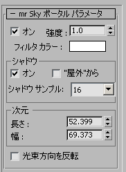 選択し、Sky ポータル オブジェクトを選択します。[mr Sky ポータル パラメータ](mr Skylight Portal Parameters)ロールアウトで、[シャドウ](Shadows)をオンにします。