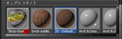 スレート マテリアル エディタを開きます。[サンプル スロット](Sample Slots)グループを見つけます。 アーチ オブジェクト用に、brick-soldier という名前のマテリアルが既に準備されています。